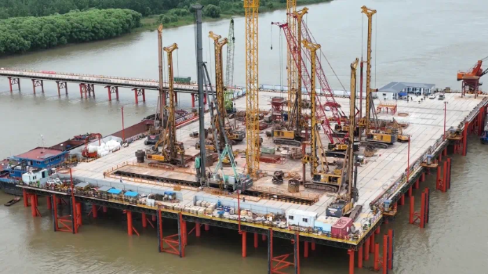 4 号主墩处主要岩性为粉砂质泥岩、泥岩及粉砂岩等,岩层浸水易软化、崩解。由于大桥主墩属于江中墩,主墩所在的长江水面下施工情况庞大,水流湍急,河床面有较大高差,钻进的土层较硬,这给大桥的超长、超深桩基础等施事情业带来一定的难度。另江面平台作业面狭小,宁静成为事情的重中之重。