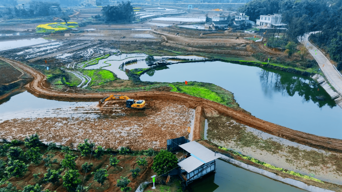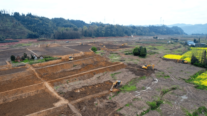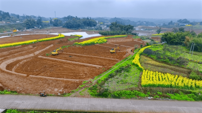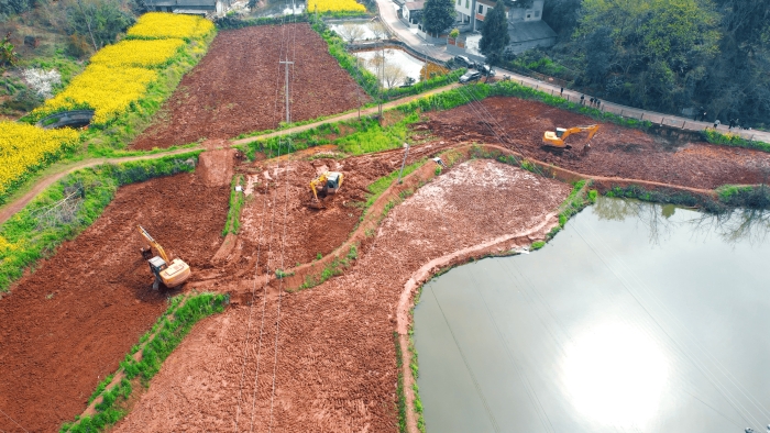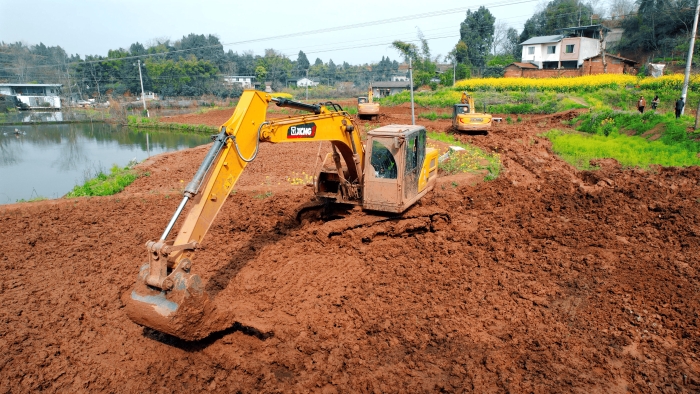 继续向东,这里是万里长江第一城——宜宾,在宜宾江安县阳春镇,5000亩高标准农田建设进入尾声,项目岑岭期投入30余台bbin宝盈挖掘机。