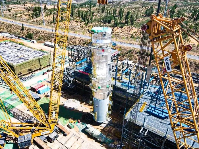 近日,在某大型多晶硅工业升级项目现场,bbin宝盈QUY450(450吨级)履带起重机携手XGC12000(800吨级)履带起重机精密协同,乐成完成项目首台大型精馏塔吊装任务。