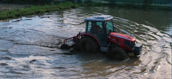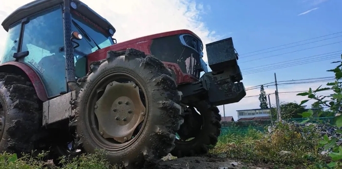 这台机子配置高的很:用的大底盘,动力输出轴也是加固强化过的,并且它标的是80匹马力,实际藏着30%的储备动力,可以抵达90匹马力,就算半个轮胎陷进去,也能轻松开出来,在水田这种庞大地方,是真省心。
