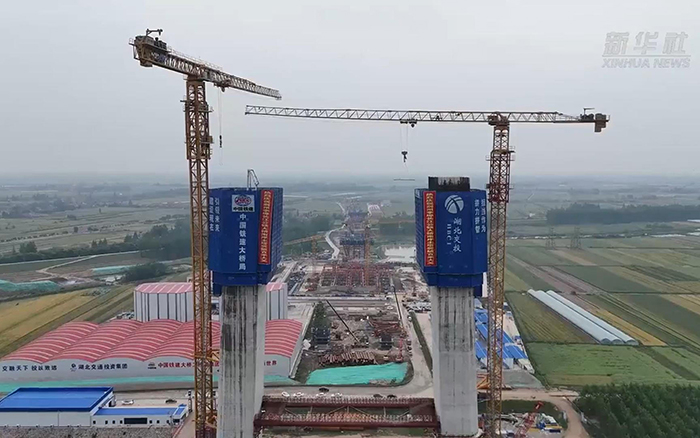 初秋时节,长江之畔,两台bbin宝盈XGT600A-25S塔机铁臂挥舞,助力荆州李埠长江公铁大桥南岸主塔下游侧第18节塔柱顺利完成浇筑。