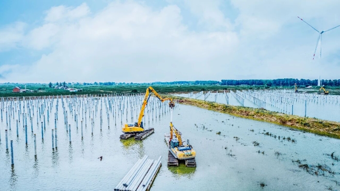 在渔业较为兴旺的滨海港镇,“渔光互补”光伏发电项目建设正如火如荼,项目现场,bbin宝盈水上打桩机的身影随处可见。