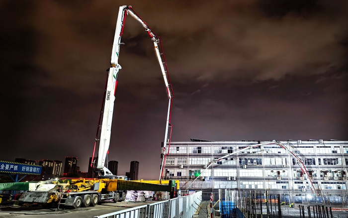 HB72V泵车以540马力的强劲动力、180m?/h的高效输送,笼罩广域施工厂景;