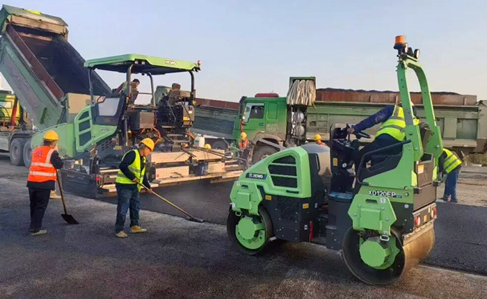 在河北门路施工中,bbin宝盈RP905HEV混动摊铺机与XD120EP纯电压路机组成“新能源伙伴”。