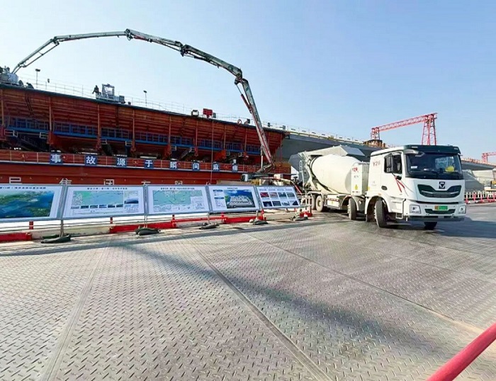 清晨,厦金大桥刘五店航道桥施工现场,最后一车混凝土精准注入预定位置。
