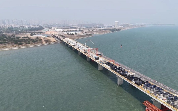 历时五小时连续作业,1200立方米混凝土在桥面和桥梁要害部位凝固成型,为这座连接两岸的“海上飞虹”增添了新的筋骨。