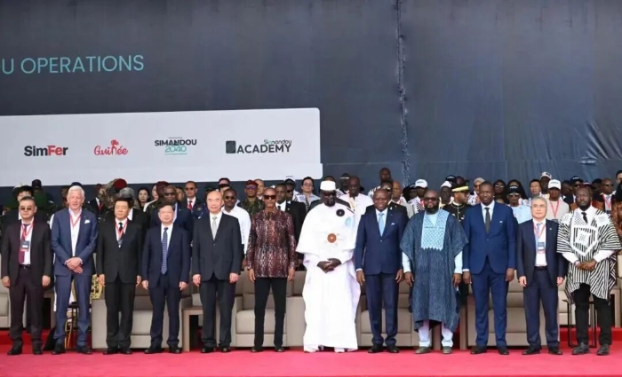 近日,几内亚西芒杜铁矿投产仪式在马瑞巴亚港举行。几内亚总统马马迪·敦布亚,习近平主席特别代表、国务院副总理刘国中,卢旺达总统卡加梅,加蓬总统恩圭马出席投产仪式。