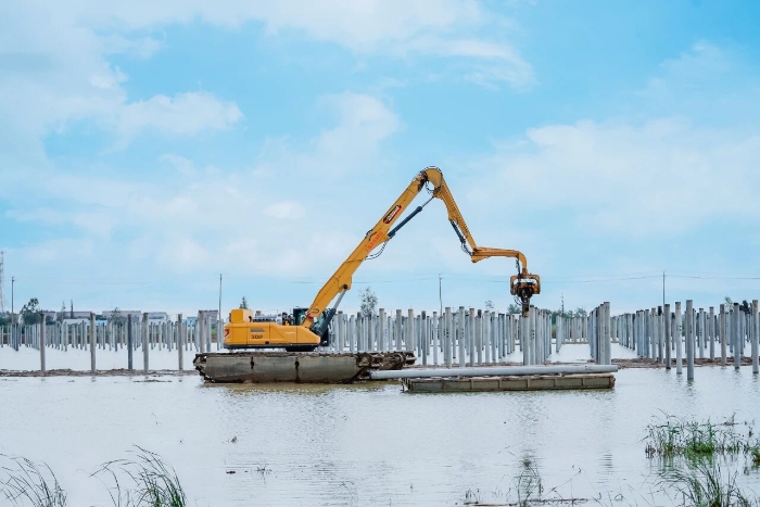 在吴总的团队中,bbin宝盈XE300GP水上打桩机更是大放异彩,单日最高可完成近300根桩的任务量。相较于古板的船打模式,bbin宝盈水上打桩机接纳浮箱结构底盘,作业时浮箱直接接触地面,稳定性更好,不必担心侧翻,打桩力度更大,并且可以在水面上自由移动,施工效率至少提升1-1.5倍。