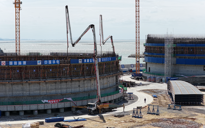 随着各环节建设有序推进,3座22万立方米的LNG(液化天然气)储罐正式进入罐体墙体浇筑。每座储罐高达50多米,相当于18层楼高度,海风裹挟的高湿度情况,给高空作业难度层层加码!