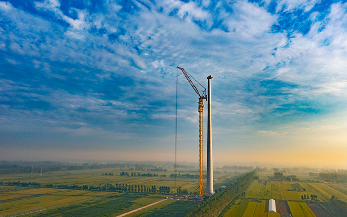 郯城风场此次吊装的风机创下区域高度纪录,接纳140米混塔+45 米钢塔结构,叶轮直径达 220 米,仅机舱与叶轮总重就超 200 吨。185 米的高空作业,风力扰动、部件对接精度等因素对吊装设备的性能提出了极致考验,毫厘之差便可能影响整座风场的并网进度。