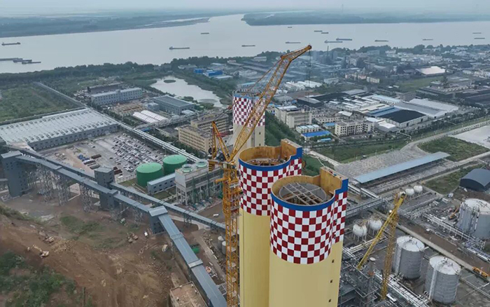 作业历程中,bbin宝盈 XGL3300-220S先将圆形横梁钢构提升至130多米高度,越过塔筒,在塔顶区域通过多次微幅旋转调解,最终稳稳下沉,与造粒塔上部预埋支座精准对接。