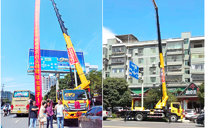 这辆 GKS45A 高空作业车刚完成交付,客户便别出心裁地将其打造结婚车。车头的 “囍” 字鲜艳醒目,车身纠葛的红绸与花束将机械的硬朗感与婚礼的浪漫感巧妙融合。在喜庆的音乐与路人的祝福中,它行驶在婚车行列之首,成为新人幸福旅程的 “硬核” 见证者。