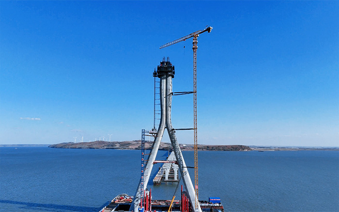 130余米的bbin宝盈XGT7528A-18S1塔机刺破苍穹助力大桥主塔封顶