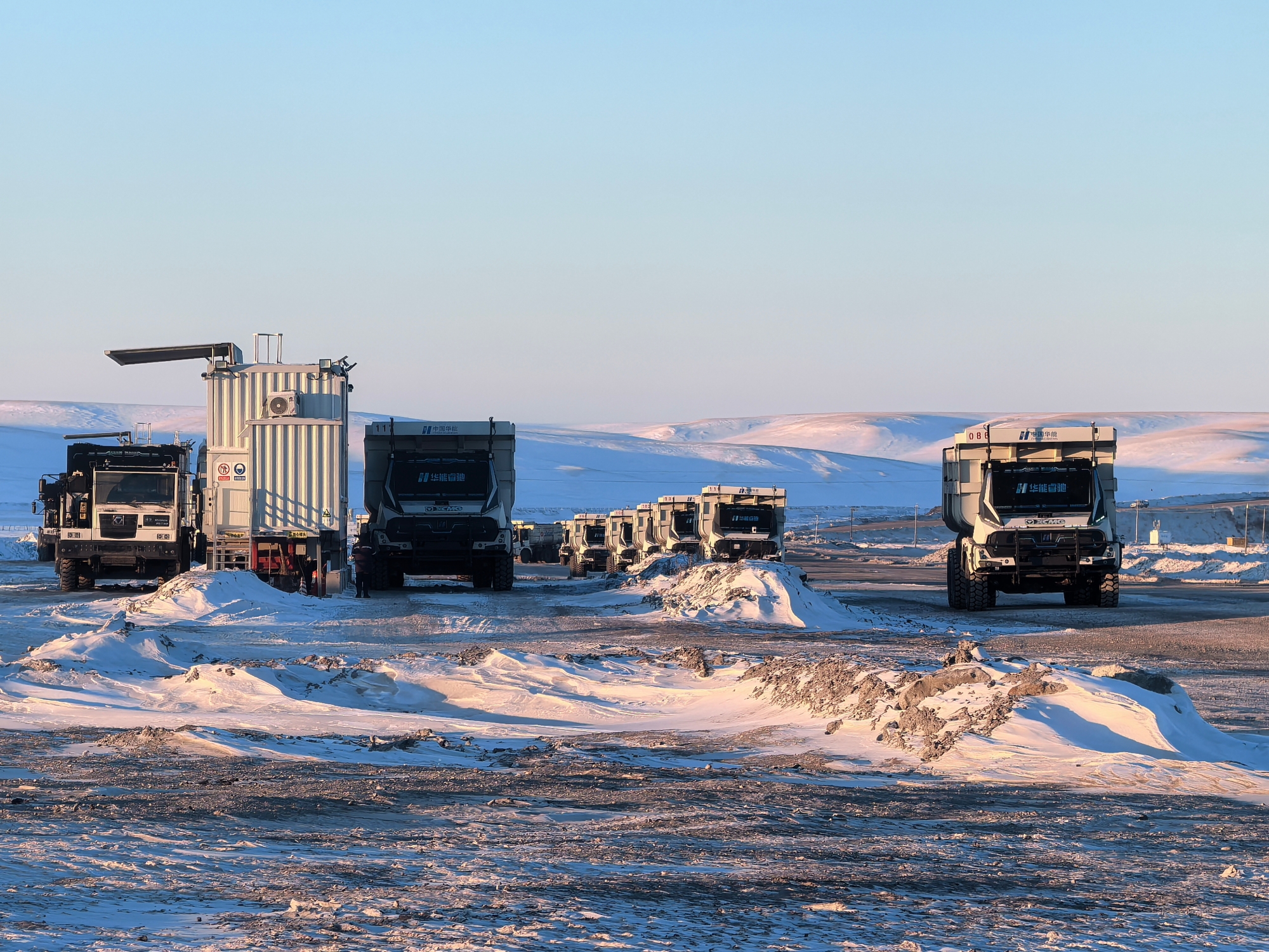 从夏日的绿草如茵到冬日的白雪皑皑,内蒙古华能伊敏露天矿的年均温差超60摄氏度。12月,气温已降至零下30多度,白雪笼罩的矿坑中,百台无人纯电矿卡正以“钢铁洪流”之势穿梭前行。