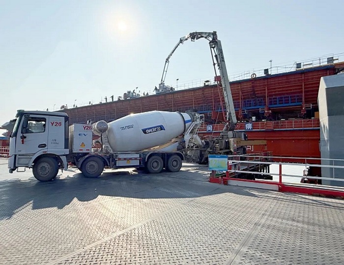 清晨,厦金大桥刘五店航道桥施工现场,最后一车混凝土精准注入预定位置。