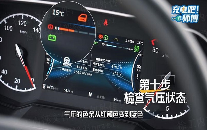 上车检查驾驶室,把钥匙打到送电档,气压的色条从红色变蓝色,证明气压足够 。