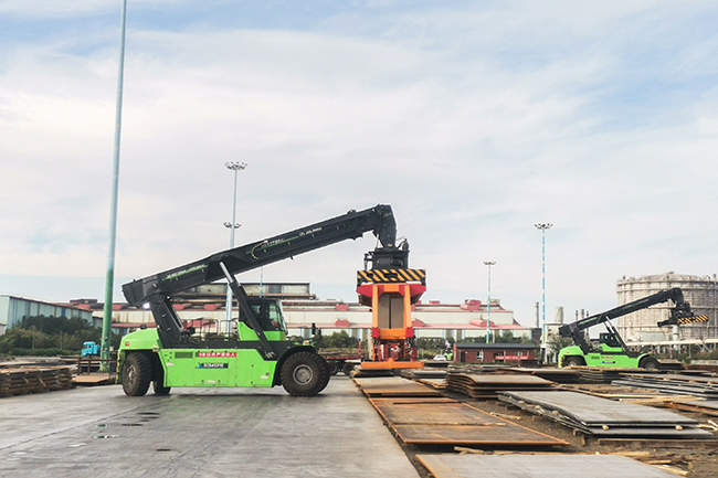 在西北某大型钢铁企业作业现场,规;度氲腷bin宝盈纯电动正面吊,配备专用电磁吊具,从容应对钢板与集装箱的混淆装卸。在连续高强度、复合化作业挑战下,设备坚持超10小时的全天候可靠续航,更以横跨勤、低故障的稳定体现,赢得客户高度认可。
