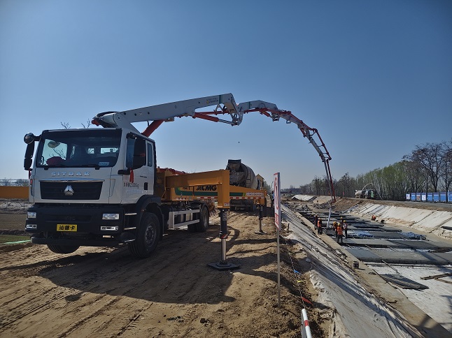 青铜峡灌区是宁夏引黄古灌区的重要组成部分,施工区域多位于田间地头和原有渠系旁,门路狭窄、作业面受限。HB37V凭借37米臂架、紧凑的整车设计,轻松进入施工点位,臂架伸展灵活,精准布料,以稳定的泵送性能和高效作业能力,连续完成浇筑任务,为春灌前工程顺利推进赢得了名贵时间。