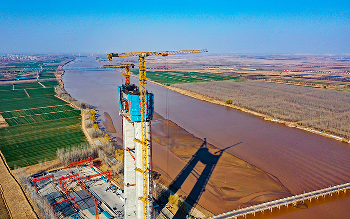这座大桥全长2230.4米、主跨600米,是黄河流域跨度最大的公铁两用斜拉桥,被誉为“黄河第一跨”。两座203.6米高的H形主塔,创下黄河同类桥塔之最。大桥接纳“公路在上、铁路在下”模式,下层为设计时速350公里的双线高铁。